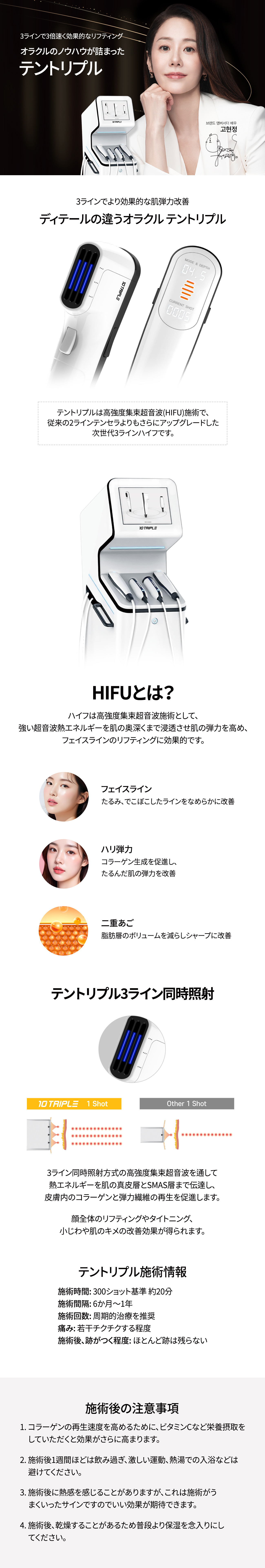 テントリプルは高強度集束超音波(HIFU)施術で、従来の2ラインテンセラよりアップグレードした次世代3ラインハイフです。